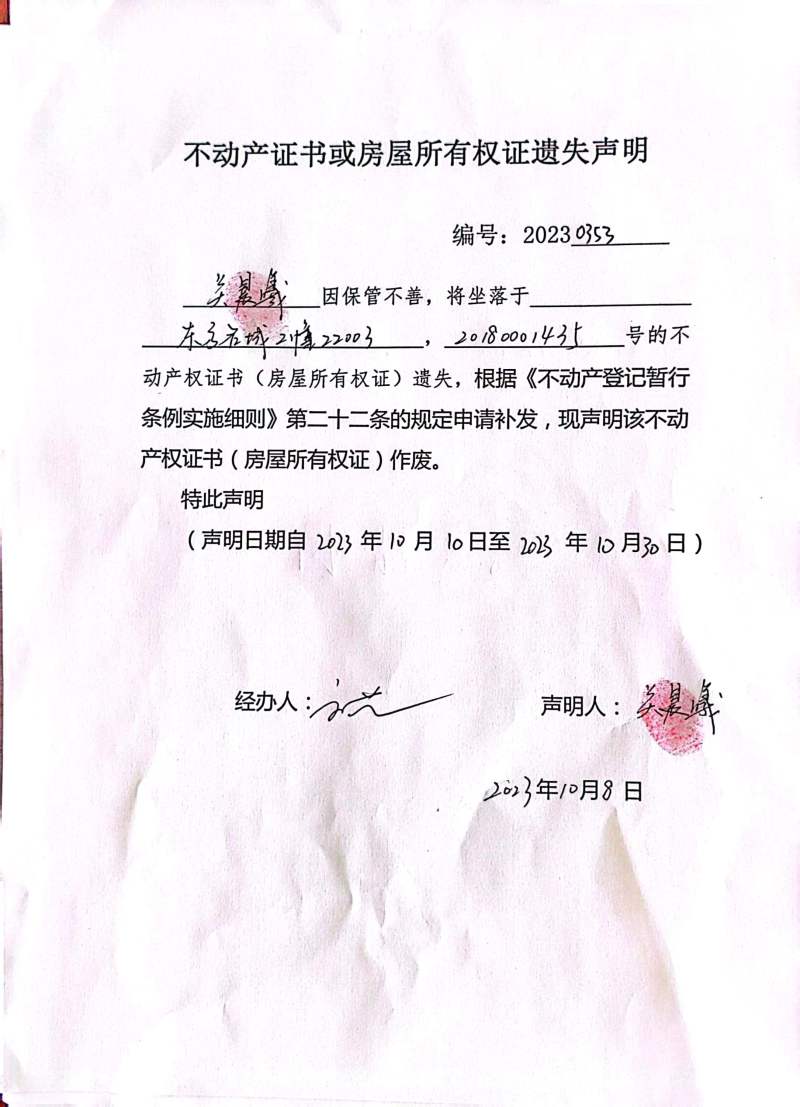 關晨曦不動產證書或房屋所有權證遺失聲明 編號:20230353
