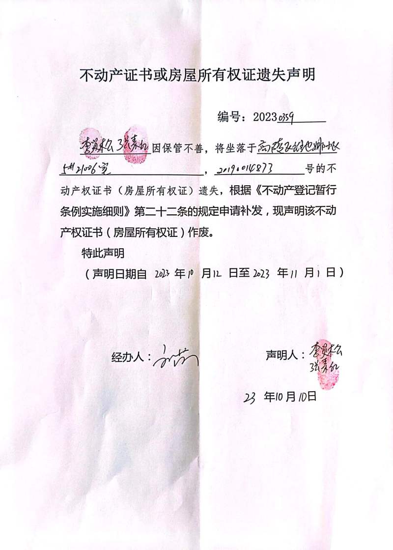 李賢松、張素紅不動產證書或房屋所有權證遺失聲明 編號:20230359