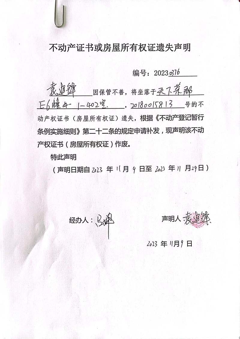 不動產(chǎn)證書或房屋所有權(quán)證遺失聲明 編號:20230376