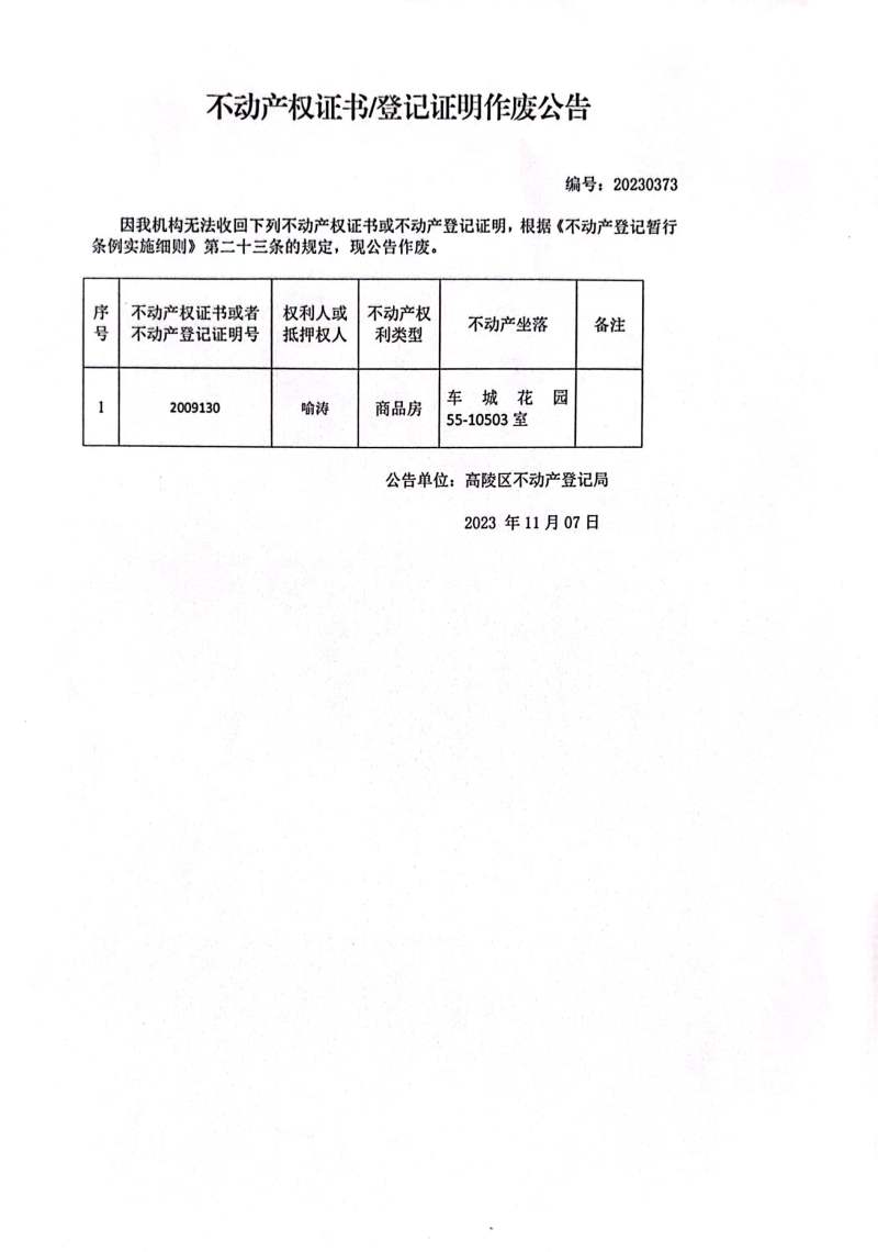 不動產權證書或房屋所有權證作廢公告編號:20230373
