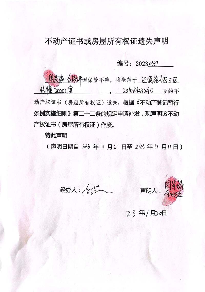 周榮濤、余曉平不動產(chǎn)證書或房屋所有權證遺失聲明 編號:20230387