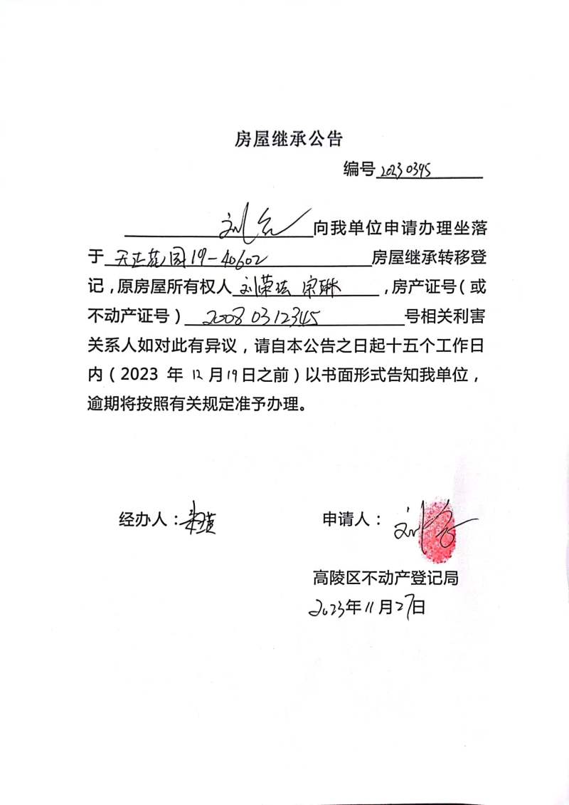 劉念房屋繼承公告 編號:202300395