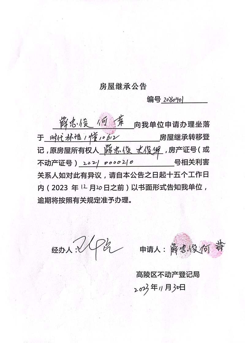 薛忠俊、何茸房屋繼承公告 編號:20230401
