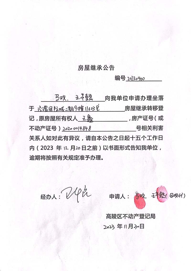 馬歡、王芊懿房屋繼承公告 編號:20230400
