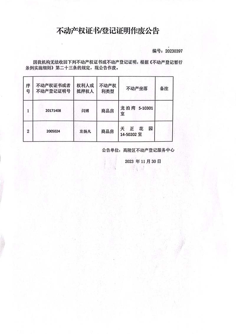 左楊帆、閆博不動產權證書或房屋所有權證作廢公告編號:20230397