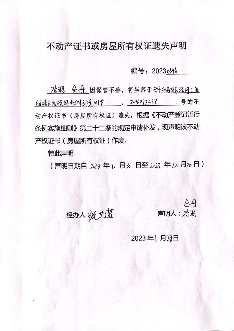 李昭、權(quán)丹不動(dòng)產(chǎn)證書或房屋所有權(quán)證遺失聲明 編號(hào):20230396