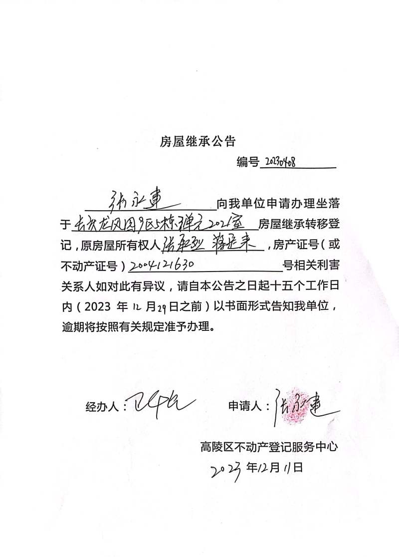 張勇建房屋繼承公告 編號:20230408