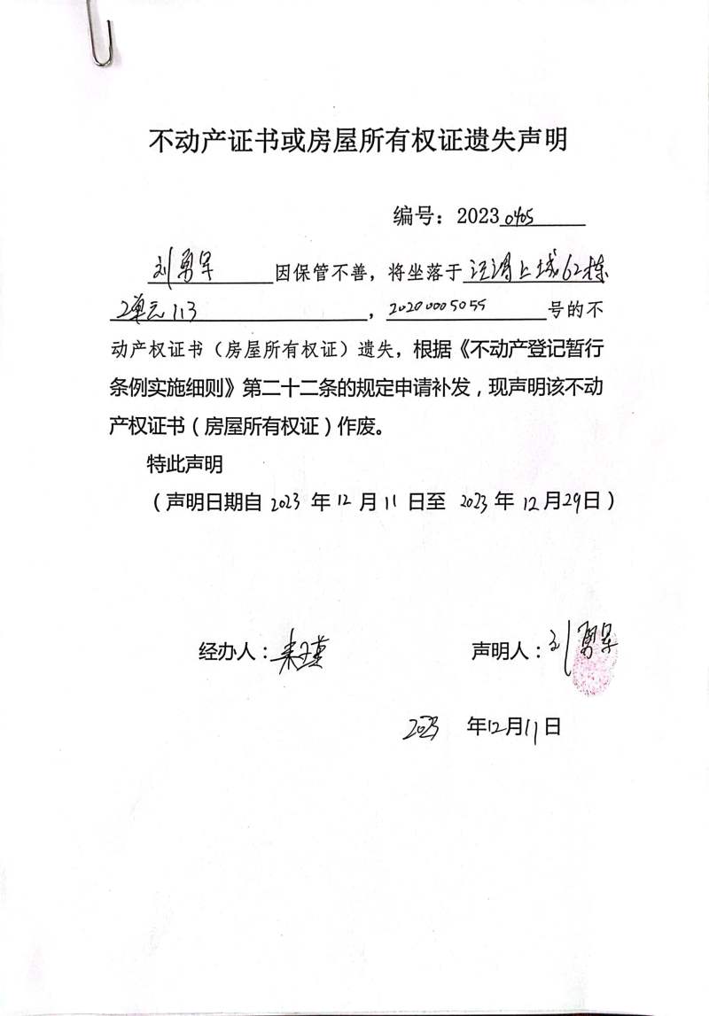 劉勇軍不動產證書或房屋所有權證遺失聲明 編號:20230405
