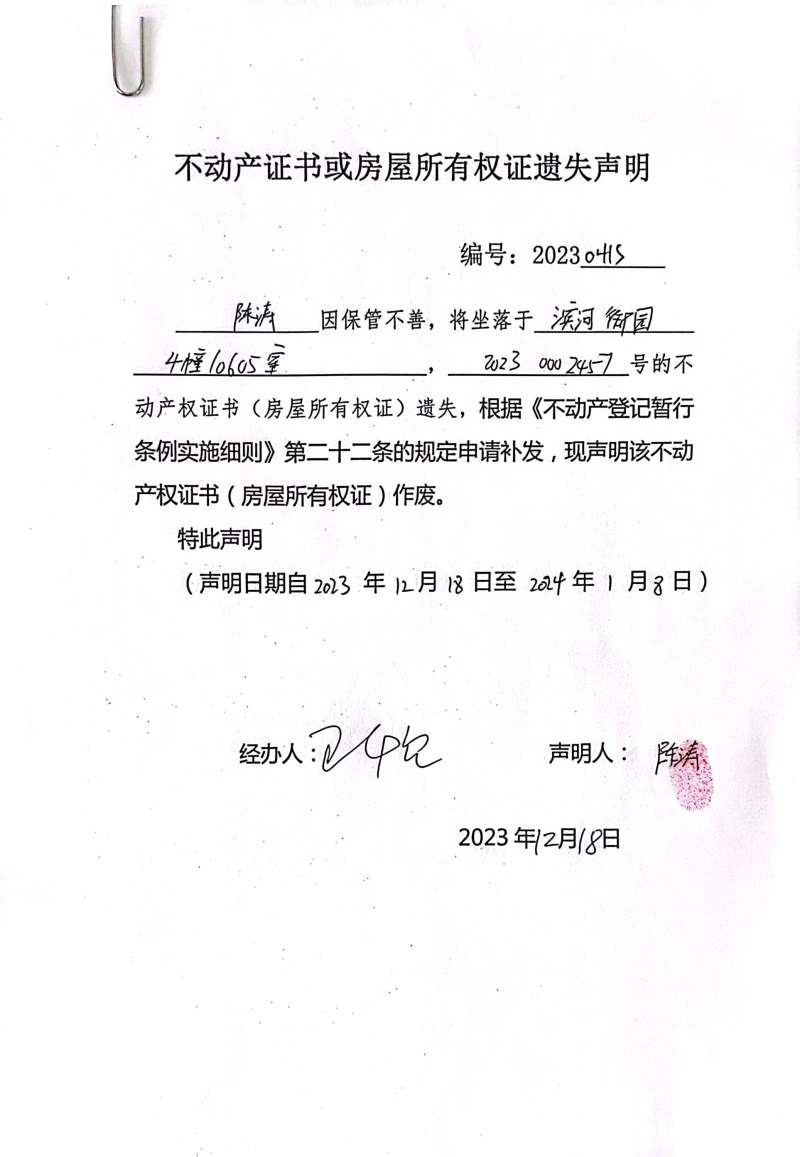 陳濤不動產證書或房屋所有權證遺失聲明 編號:20230415