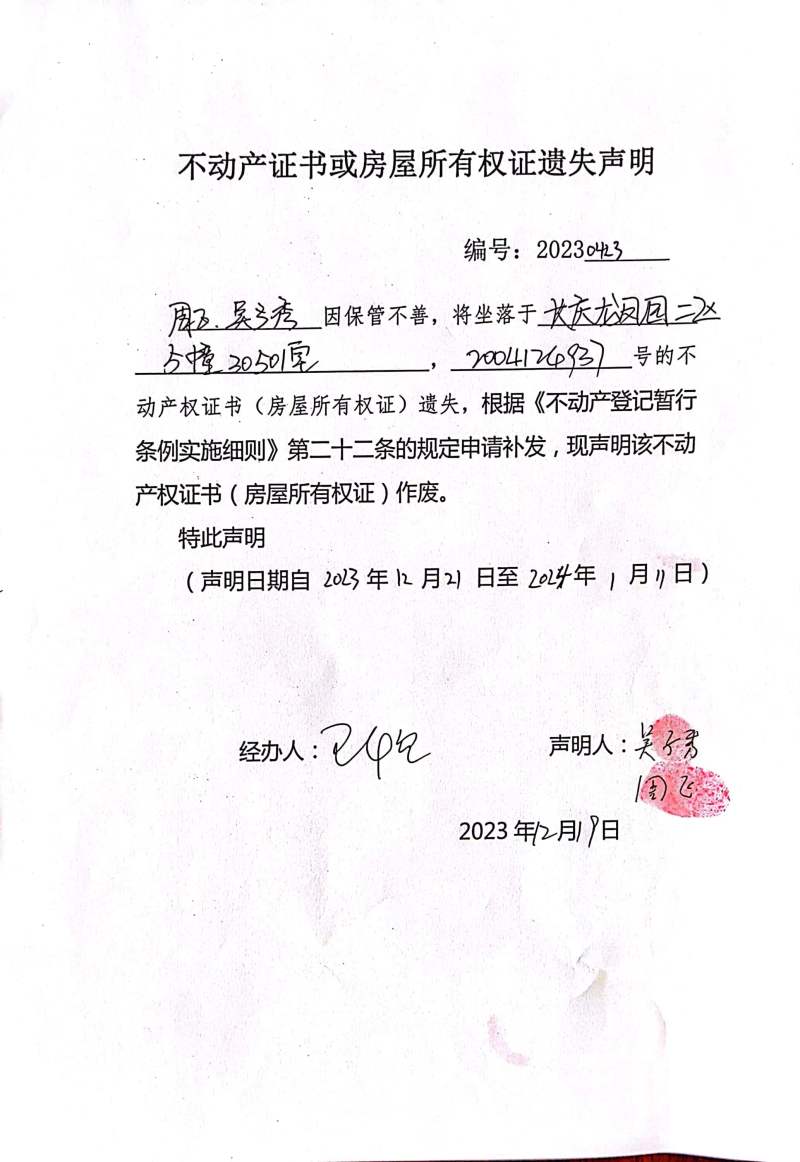 周飛、吳子秀不動(dòng)產(chǎn)證書(shū)或房屋所有權(quán)證遺失聲明 編號(hào):20230423