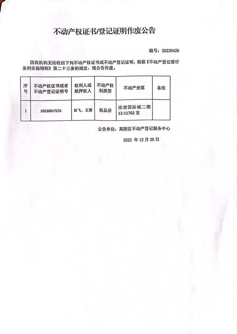 田飛、王雁不動產(chǎn)權(quán)證書或房屋所有權(quán)證作廢公告編號:20230426