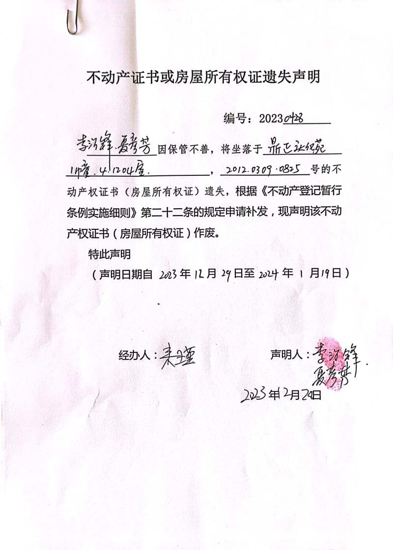 李治鋒、夏彥芳不動產證書或房屋所有權證遺失聲明 編號:20230428
