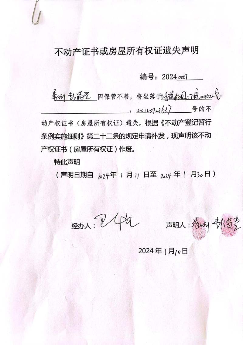 張亞利、彭滿堂不動產證書或房屋所有權證遺失聲明 編號:20240007
