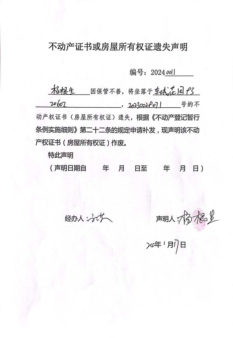 楊根生不動產證書或房屋所有權證遺失聲明 編號:20240011