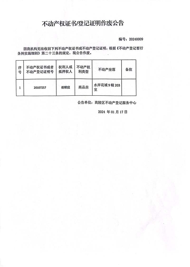 謝耀庭不動產權證書或房屋所有權證作廢公告編號:20240009