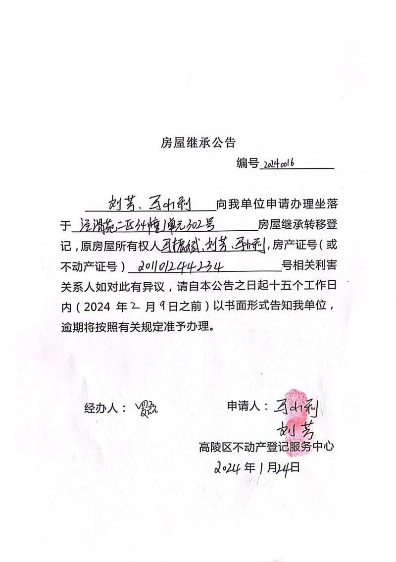 劉芳、馬小利房屋繼承公告 編號:20240016