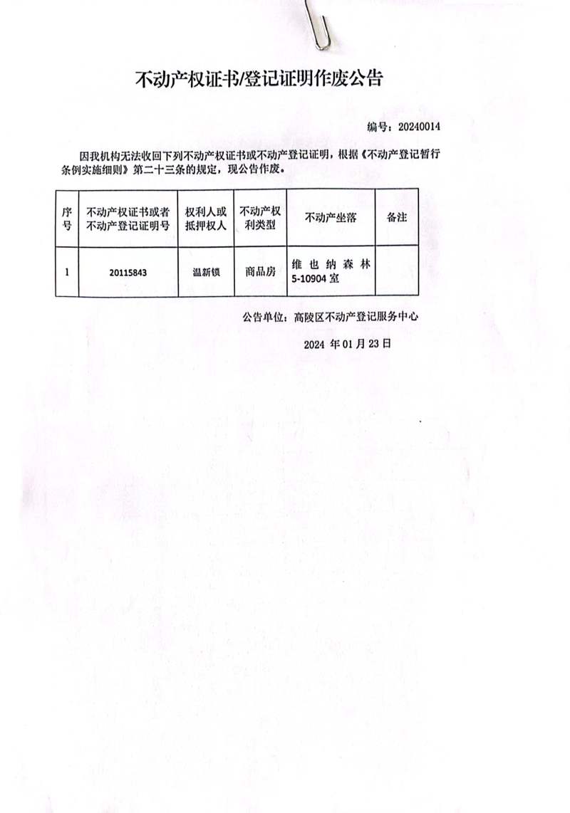 溫新鎖不動(dòng)產(chǎn)權(quán)證書或房屋所有權(quán)證作廢公告編號(hào):20240014