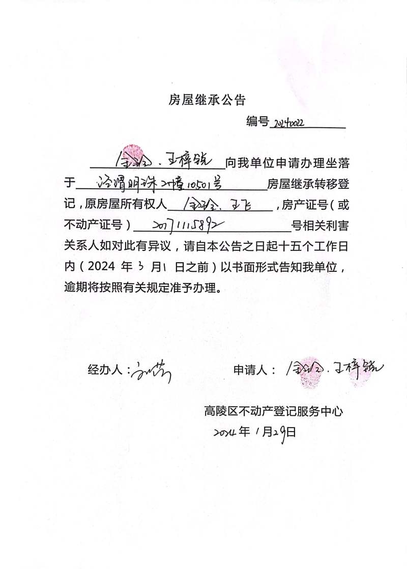 金玲、王梓銳房屋繼承公告 編號:20240022