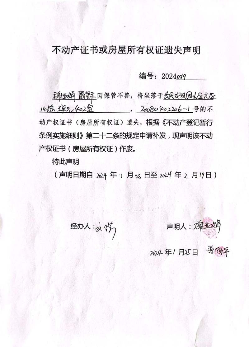 謝亞娟、雷保平不動產證書或房屋所有權證遺失聲明 編號:20240019