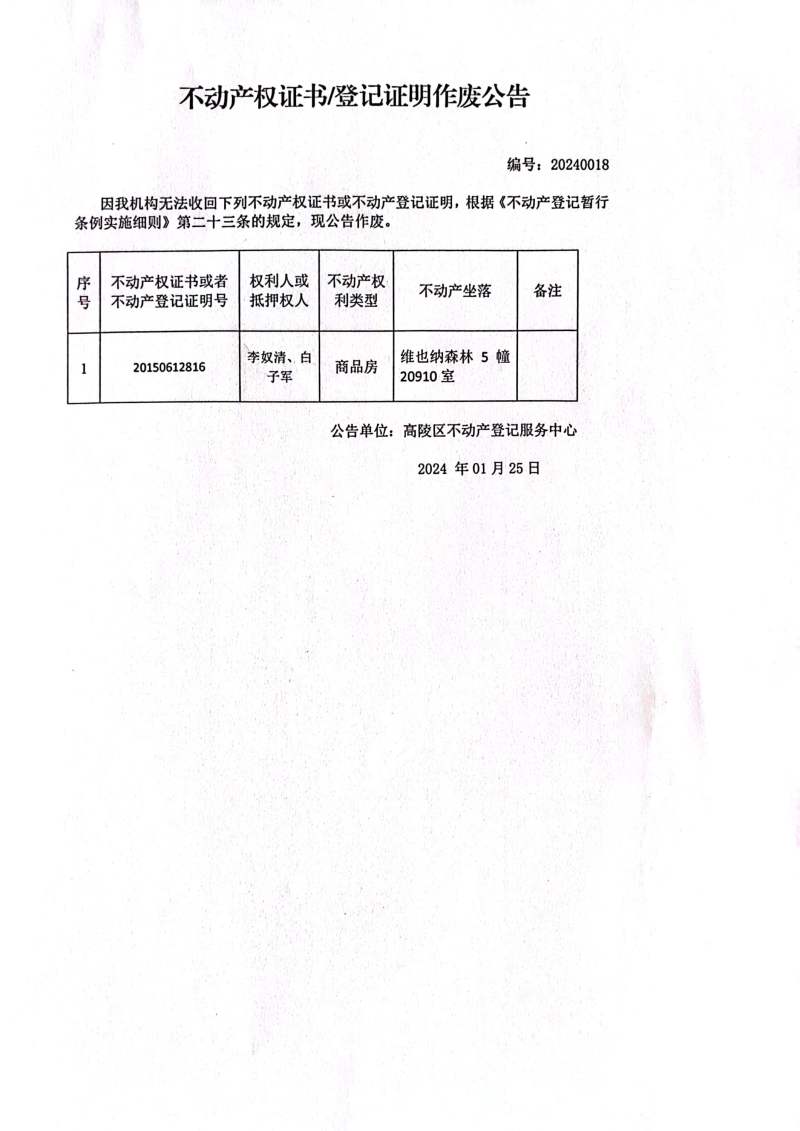 李奴清、白子軍不動產權證書或房屋所有權證作廢公告編號:20240018