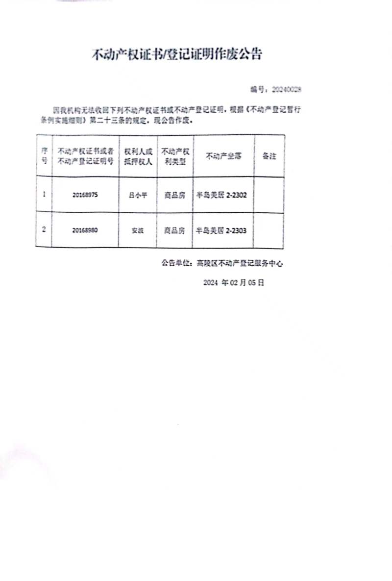 呂小平不動(dòng)產(chǎn)權(quán)證書或房屋所有權(quán)證作廢公告編號(hào):20240028