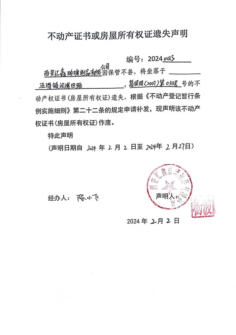 西安匯鑫玻璃制品有限公司房屋繼承公告 編號:20240025