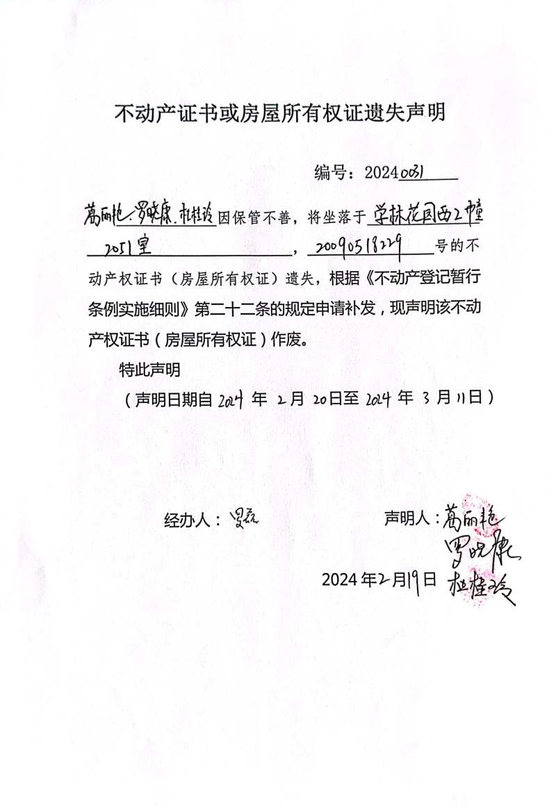 葛麗艷、羅曉康、杜桂玲不動產證書或房屋所有權證遺失聲明 編號:20240031