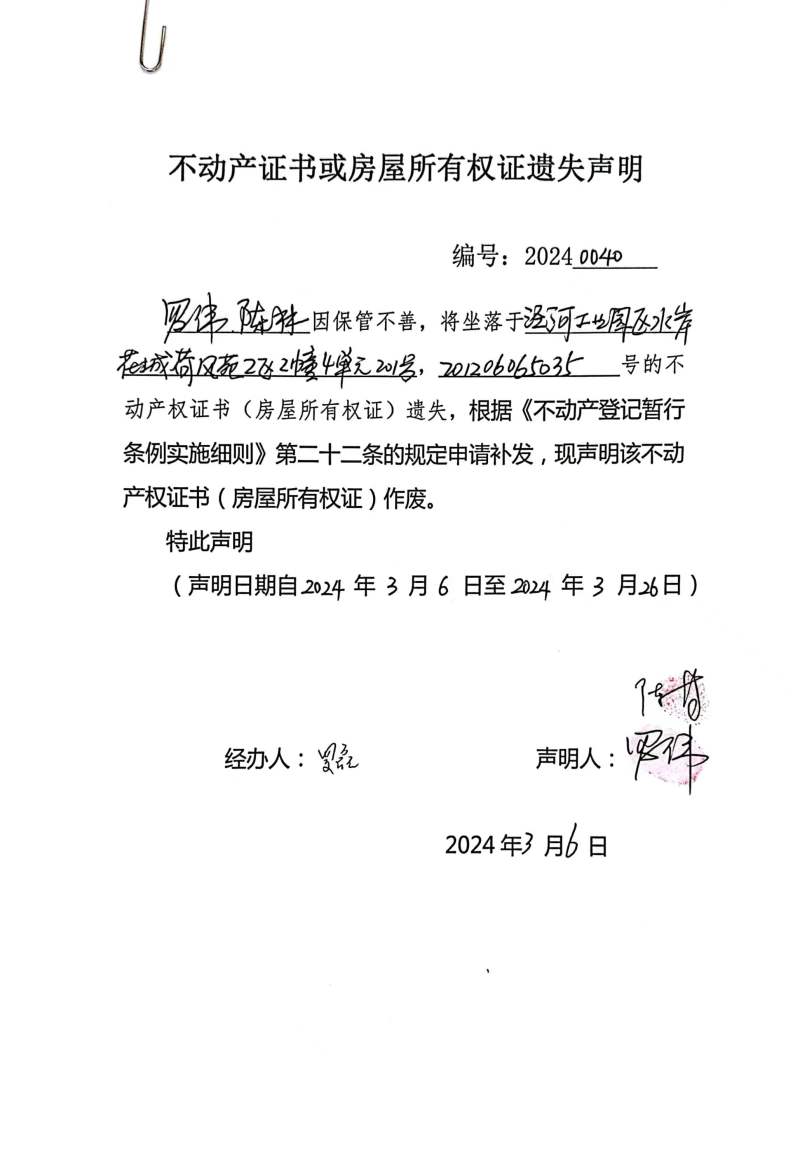 羅偉、陳林不動產(chǎn)證書或房屋所有權(quán)證遺失聲明 編號:20240040
