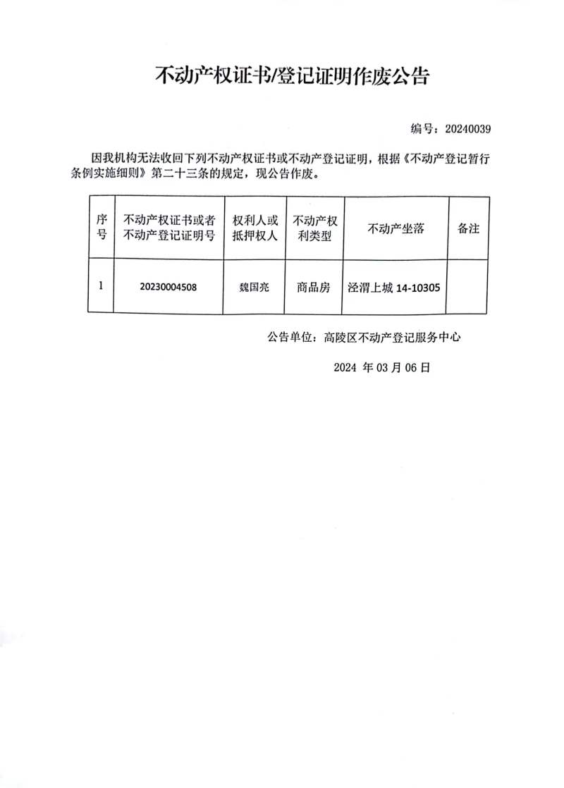 魏國亮不動(dòng)產(chǎn)權(quán)證書或房屋所有權(quán)證作廢公告編號(hào):20240039