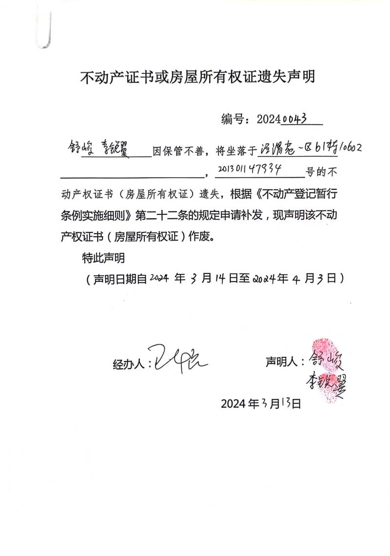舒峻、李銳翼不動產證書或房屋所有權證遺失聲明 編號:20240043