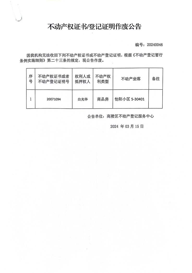 白光華不動產權證書或房屋所有權證作廢公告編號:20240046