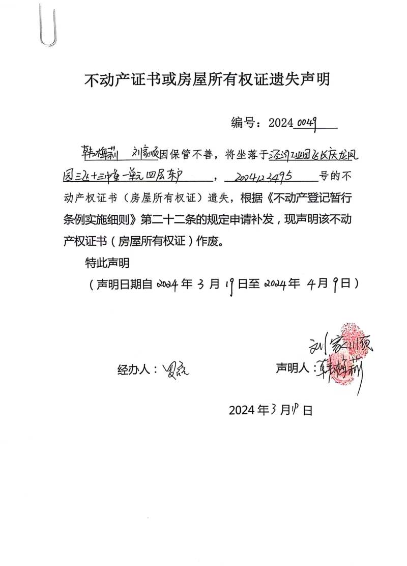 韓梅莉、劉家順 不動(dòng)產(chǎn)證書或房屋所有權(quán)證遺失聲明編號(hào):20240049