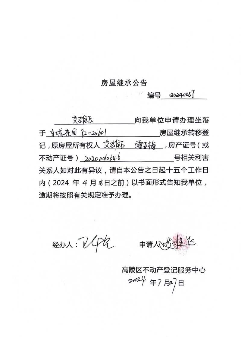 艾雄飛房屋繼承公告 編號(hào):20240057