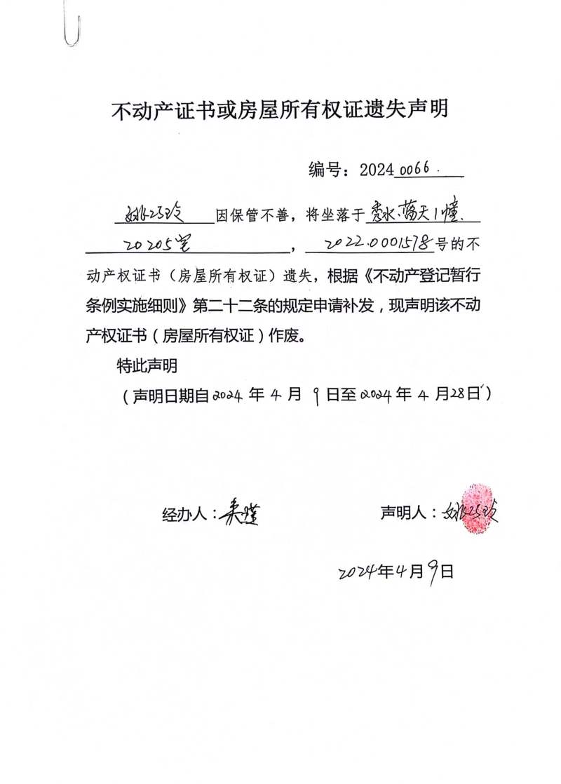 姚巧玲不動(dòng)產(chǎn)證書或房屋所有權(quán)證遺失聲明編號(hào):20240066