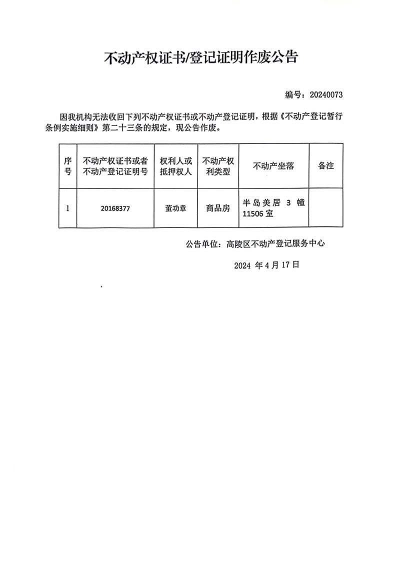 董功章不動產權證書或房屋所有權證作廢公告編號:20240073
