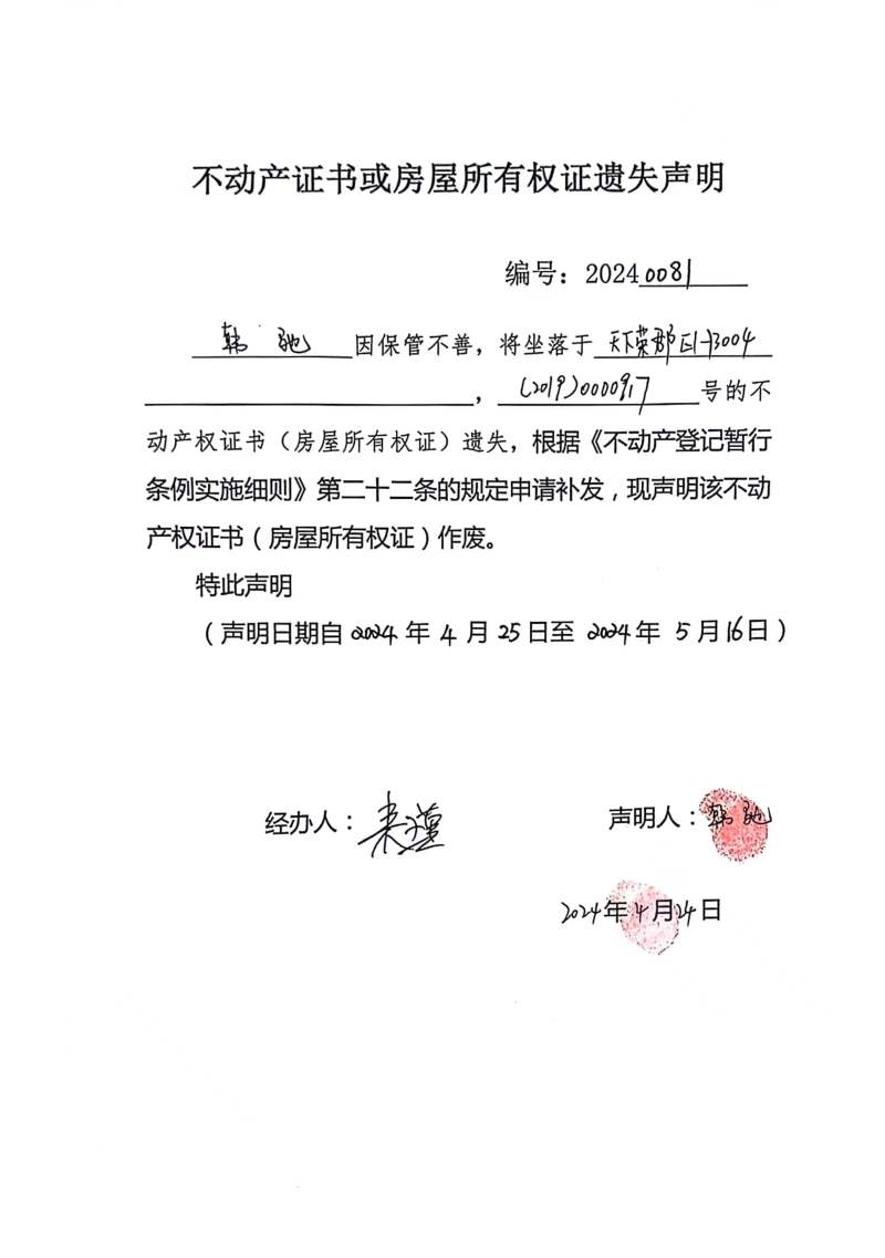韓馳不動產證書或房屋所有權證遺失聲明編號:20240081