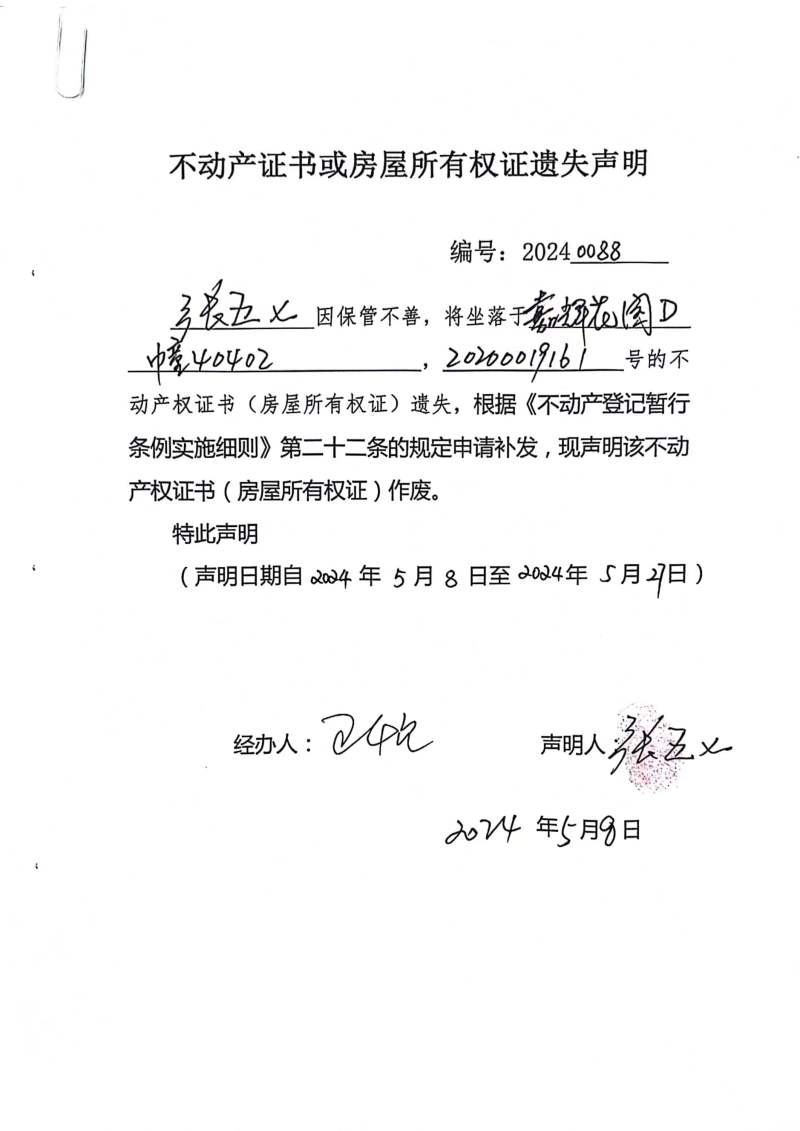 張五七不動產(chǎn)證書或房屋所有權(quán)證遺失聲明編號:20240088