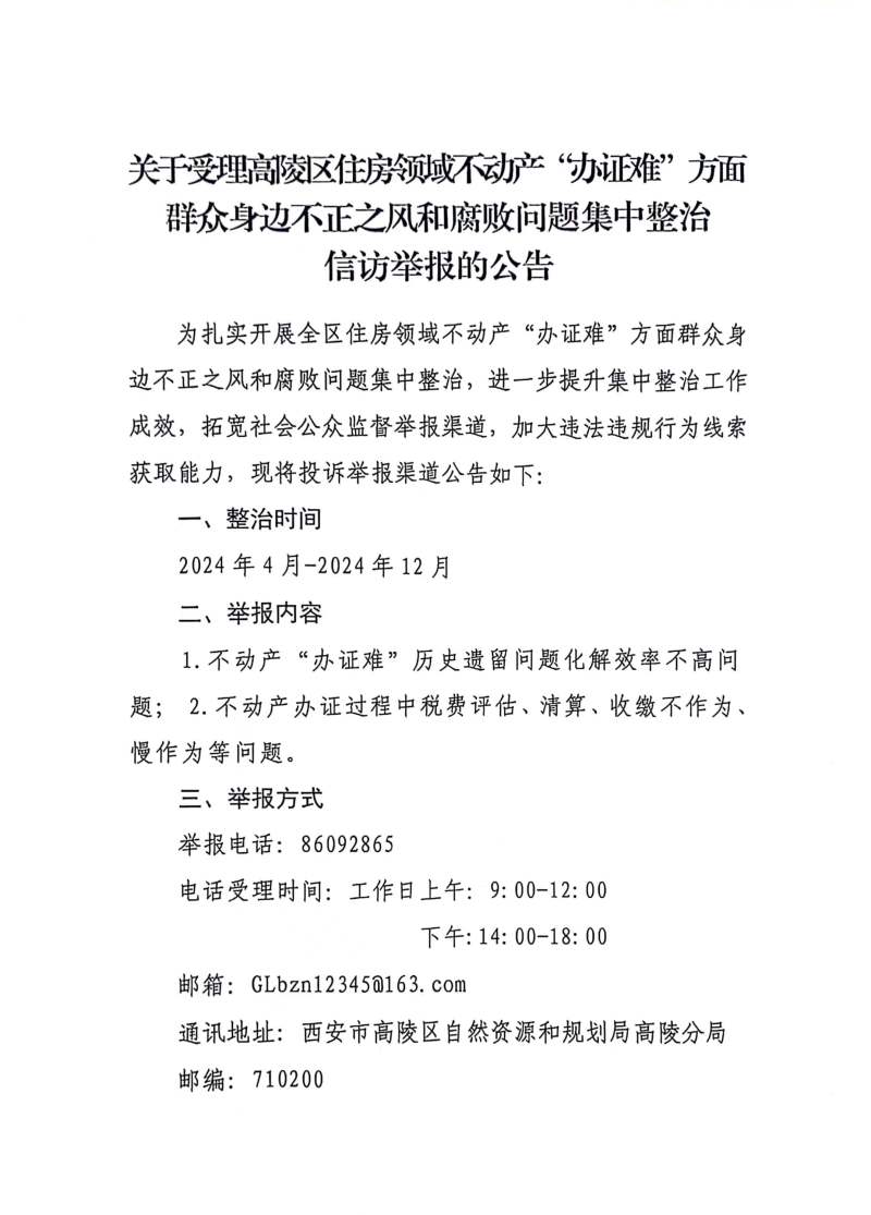 關于受理高陵區住房領域不動產“辦證難”方面群眾身邊不正之風和腐敗問題集中整治信訪舉報的公告