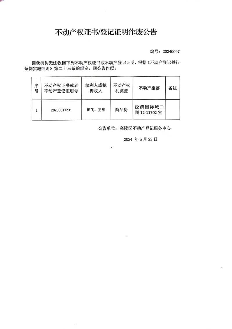 田飛、王雁不動(dòng)產(chǎn)權(quán)證書或房屋所有權(quán)證作廢公告編號(hào):20240097