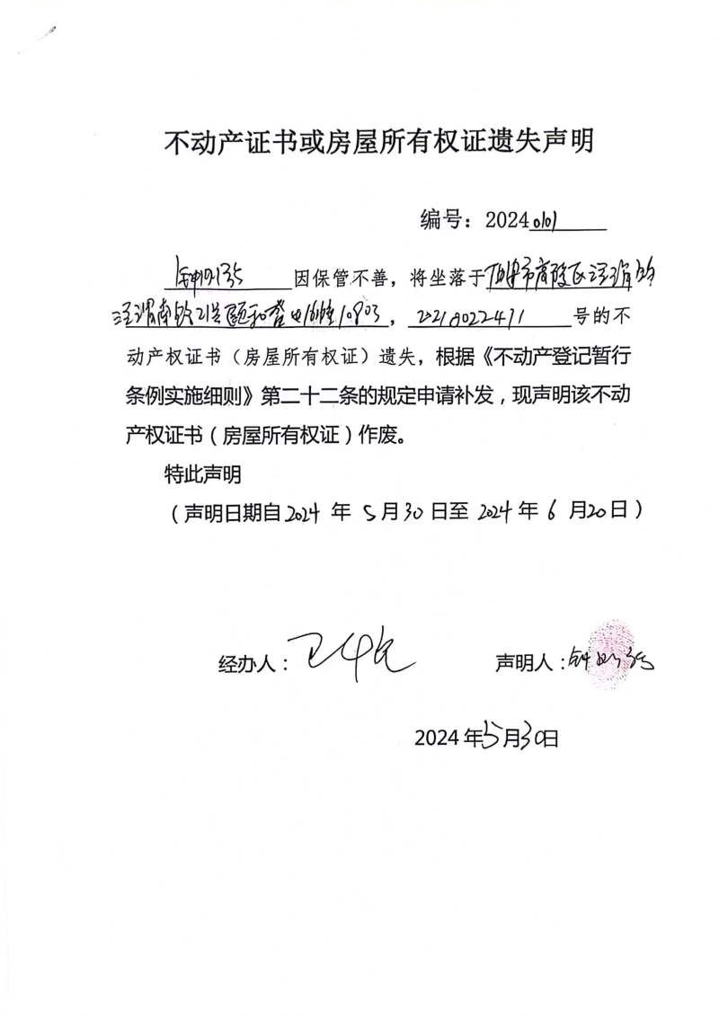 鐘剛強不動產證書或房屋所有權證遺失聲明編號:20240101