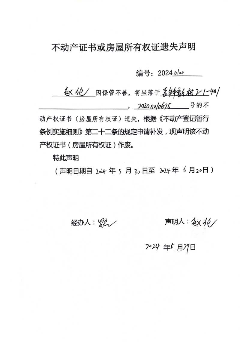 趙倫不動產證書或房屋所有權證遺失聲明編號:20240100