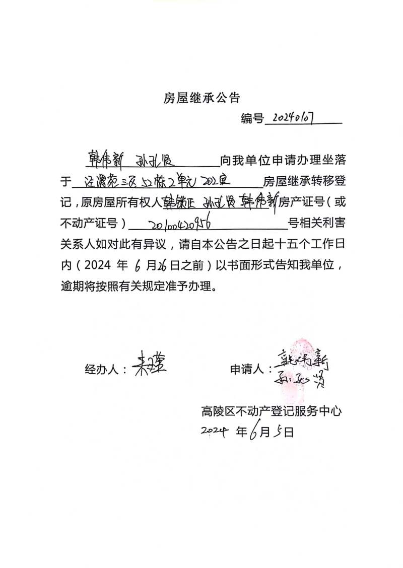 韓偉新、孫孔賢房屋繼承公告 編號:20240107