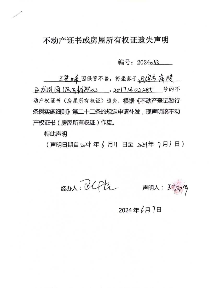 王登峰不動產(chǎn)證書或房屋所有權證遺失聲明編號:20240112