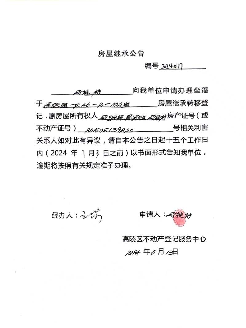 馬桂芳房屋繼承公告 編號(hào):20240117