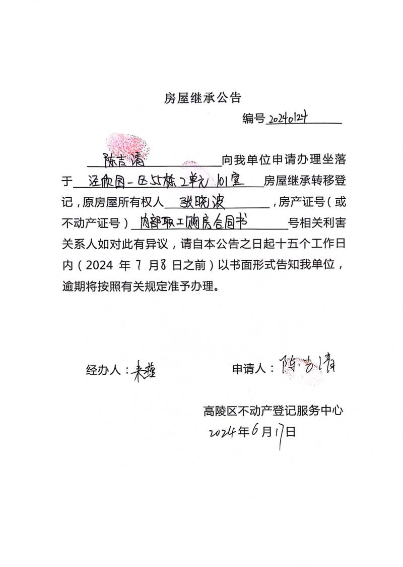 陳吉清房屋繼承公告 編號:20240124