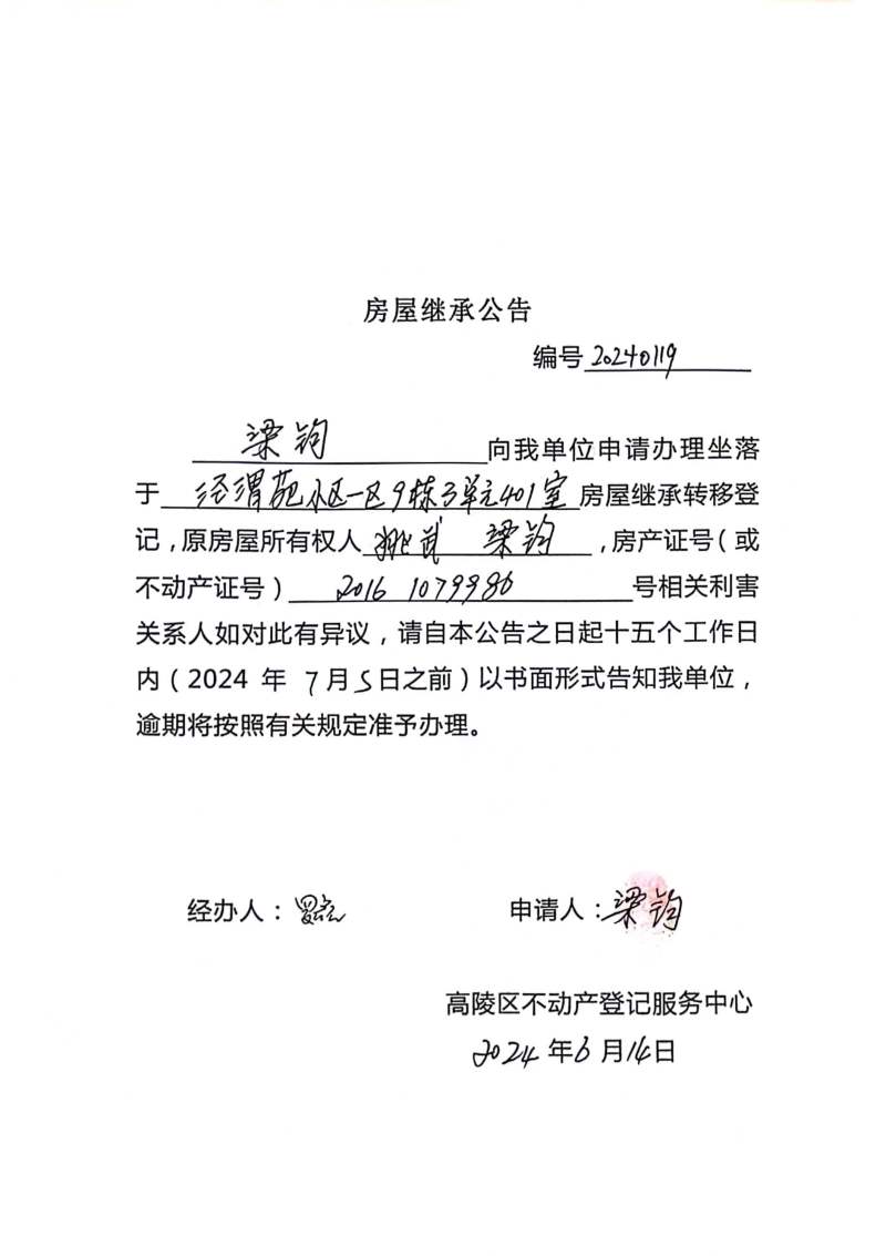 梁鈞房屋繼承公告 編號:20240119
