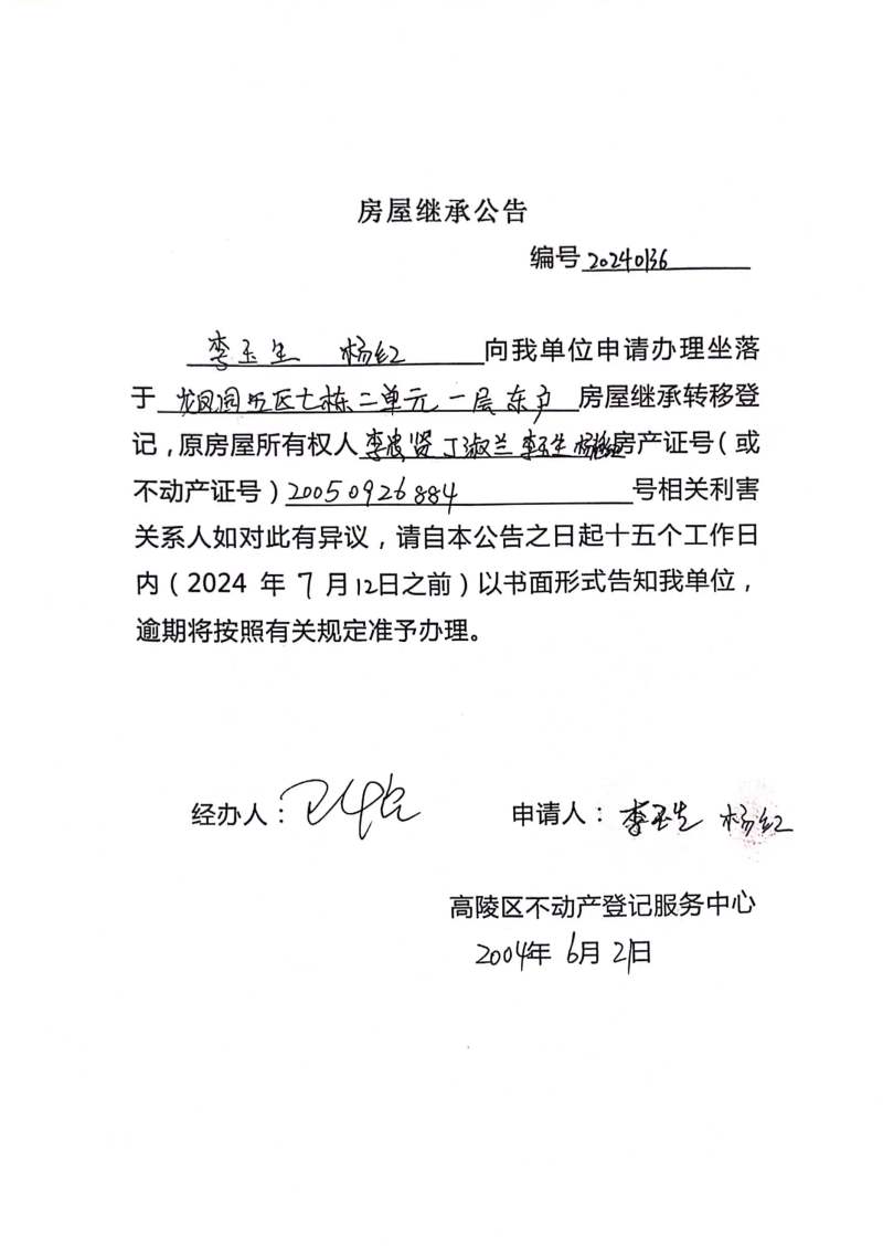 李玉生、楊紅房屋繼承公告 編號:20240136