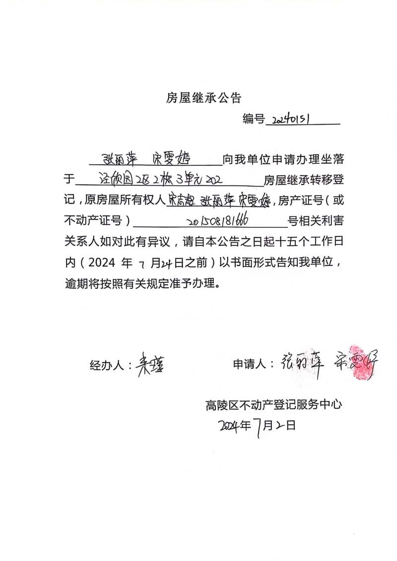 張麗萍、宋雯婷房屋繼承公告 編號:20240151