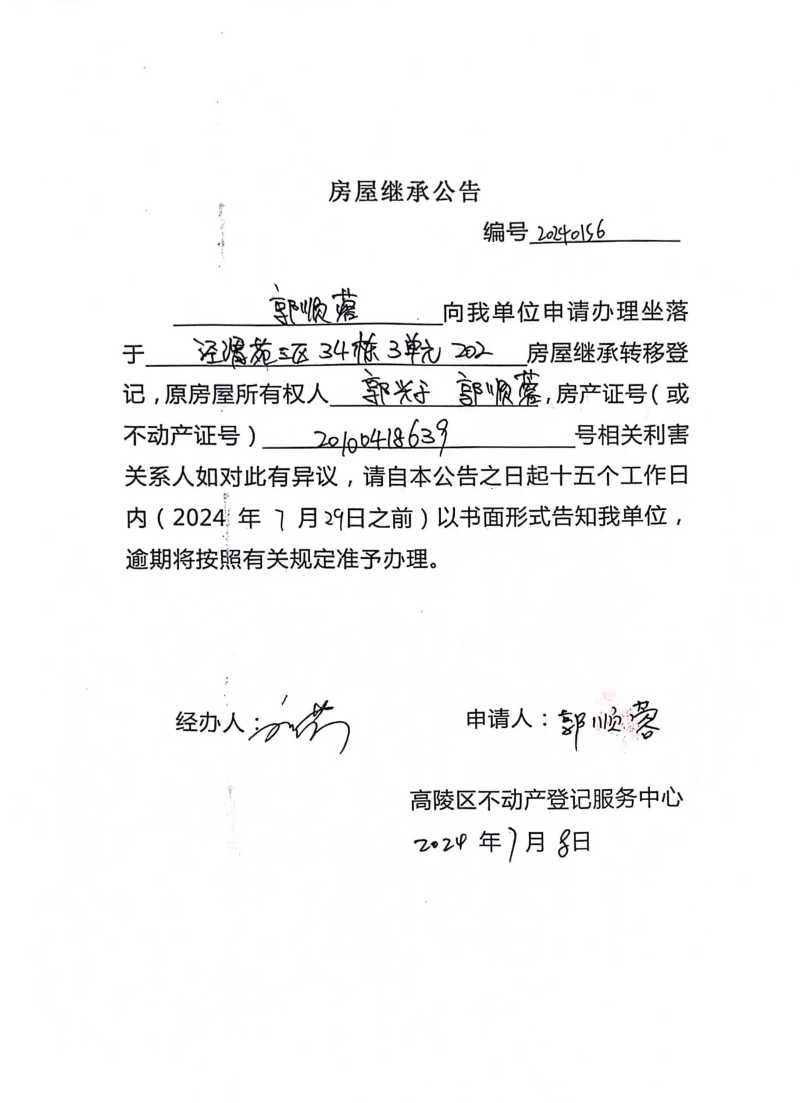 郭順蓉房屋繼承公告 編號:20240156