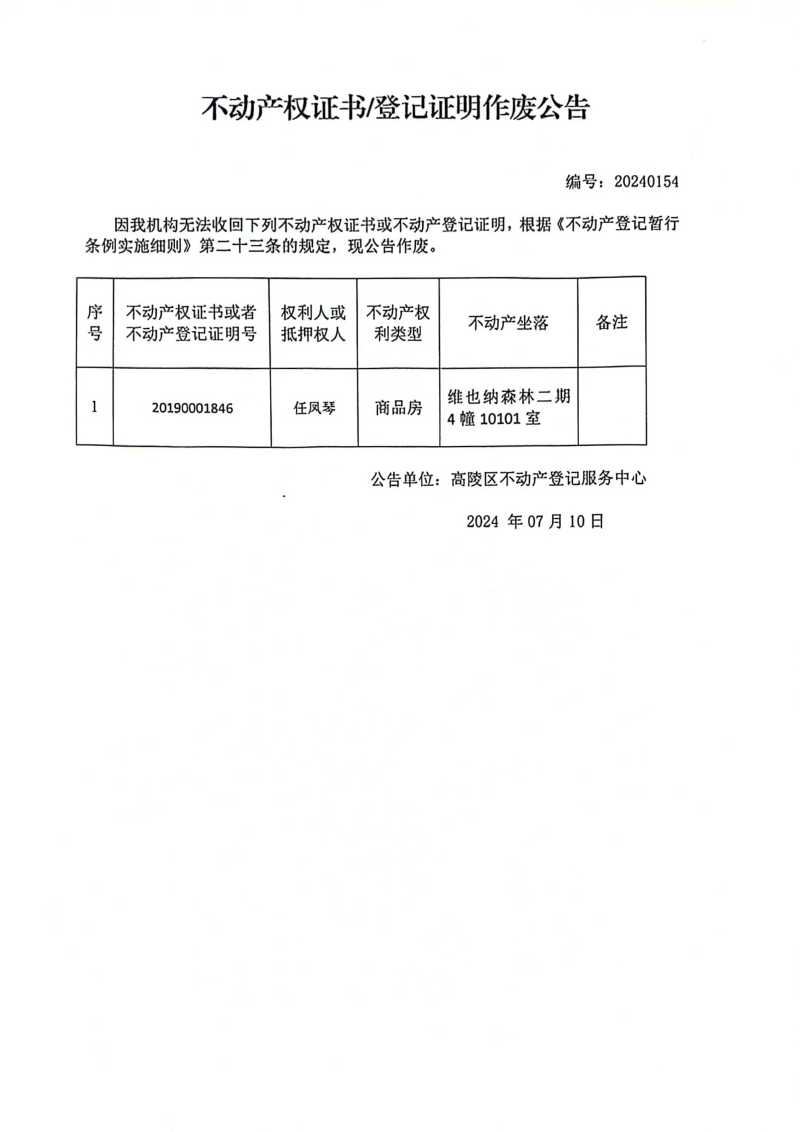 任鳳琴不動產(chǎn)權(quán)證書或房屋所有權(quán)證作廢公告編號:20240154